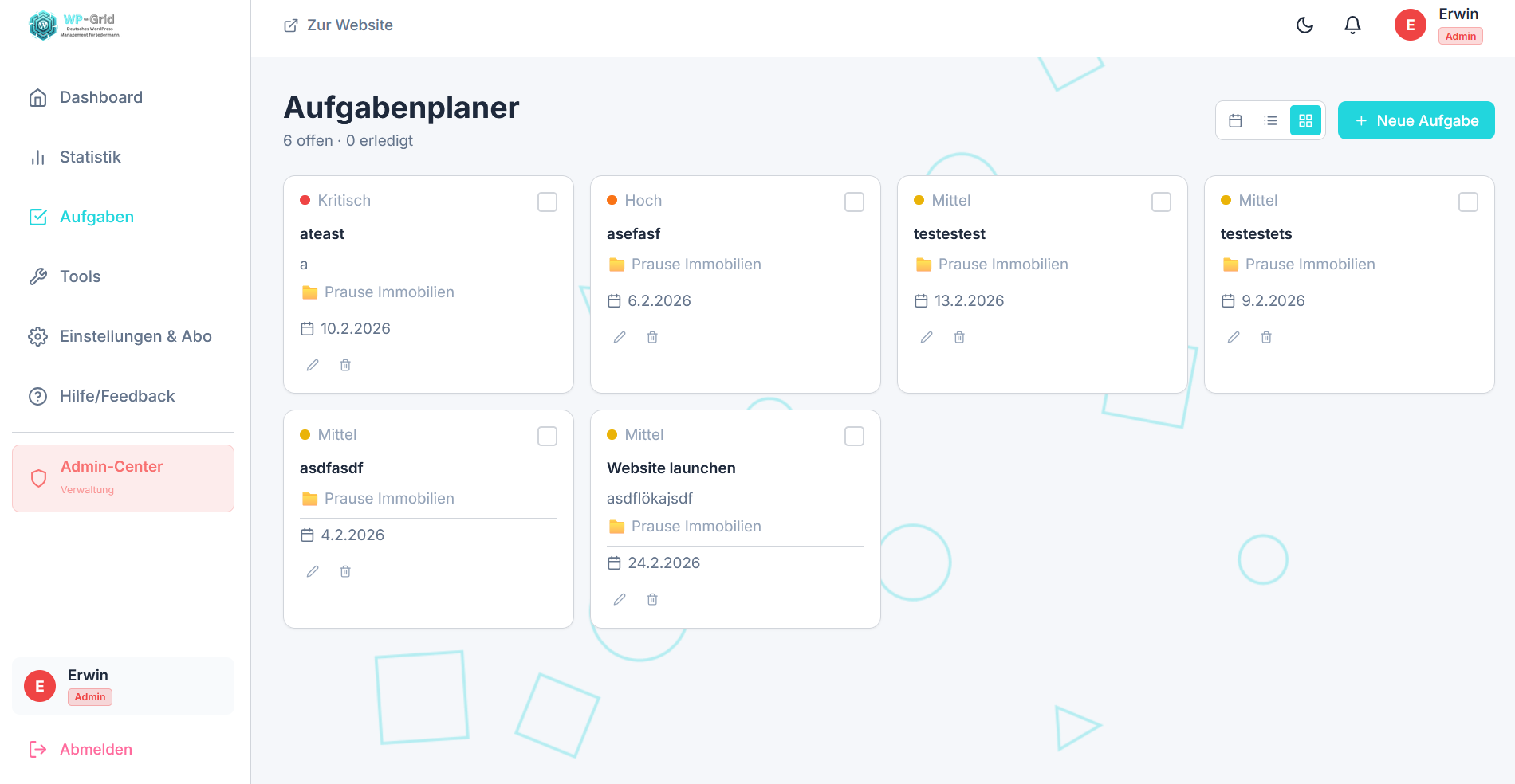 Hi, ich bin der Geschäftsführer von WP-Grid. Ich habe dieses Tool gebaut, weil ich als Webdesigner genau das gleiche Problem hatte: Zu viele Tabs, zu viele Logins, zu wenig Überblick.